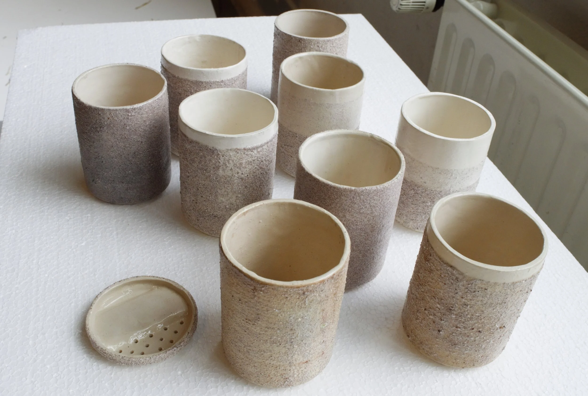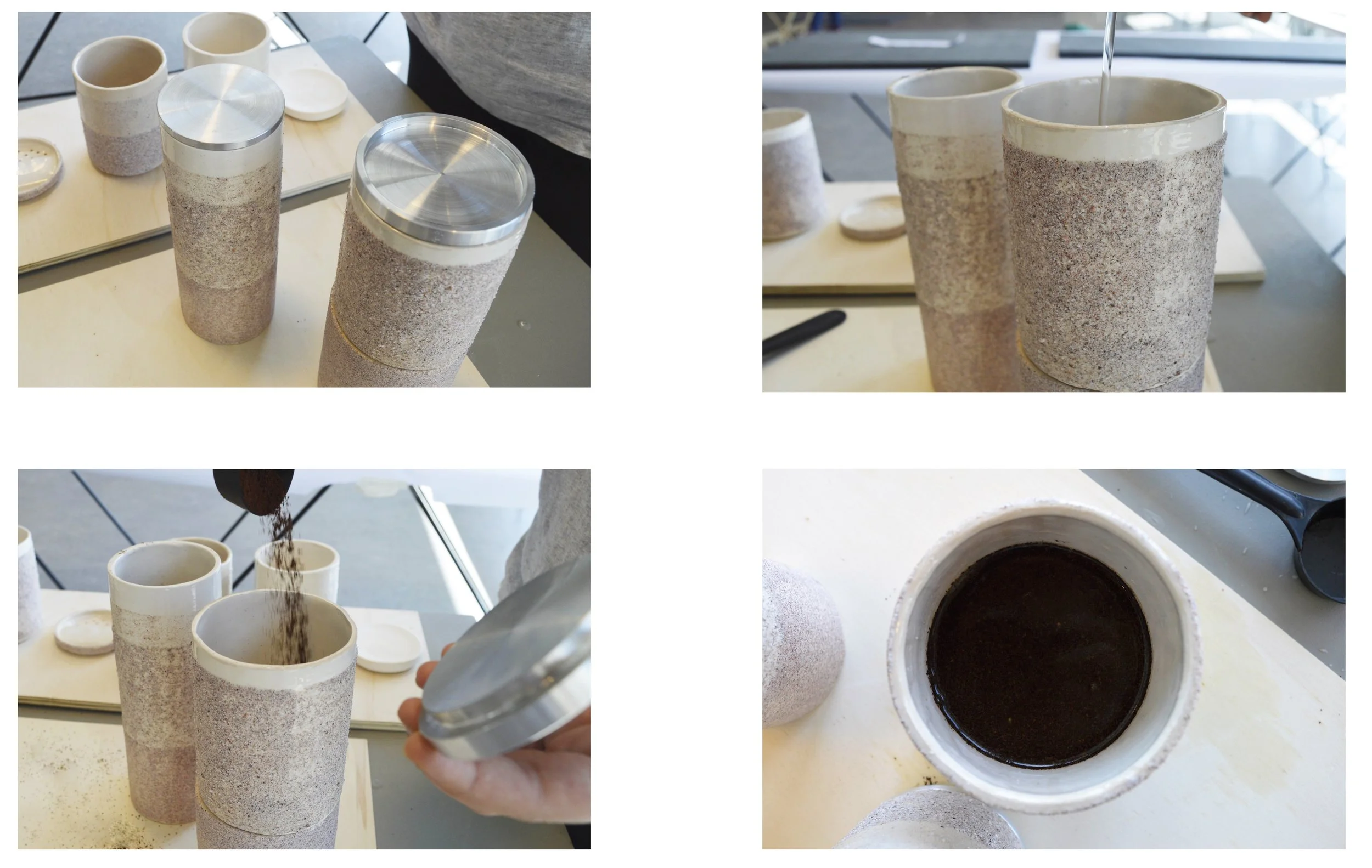 The series of ceramic objects includes a tall container for storing coffee, a filter piece with lid, and two cups.