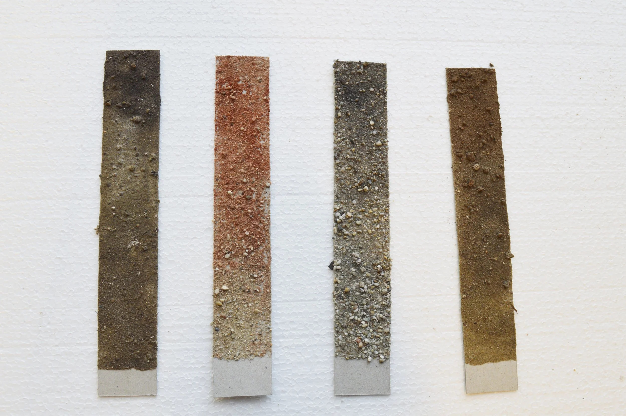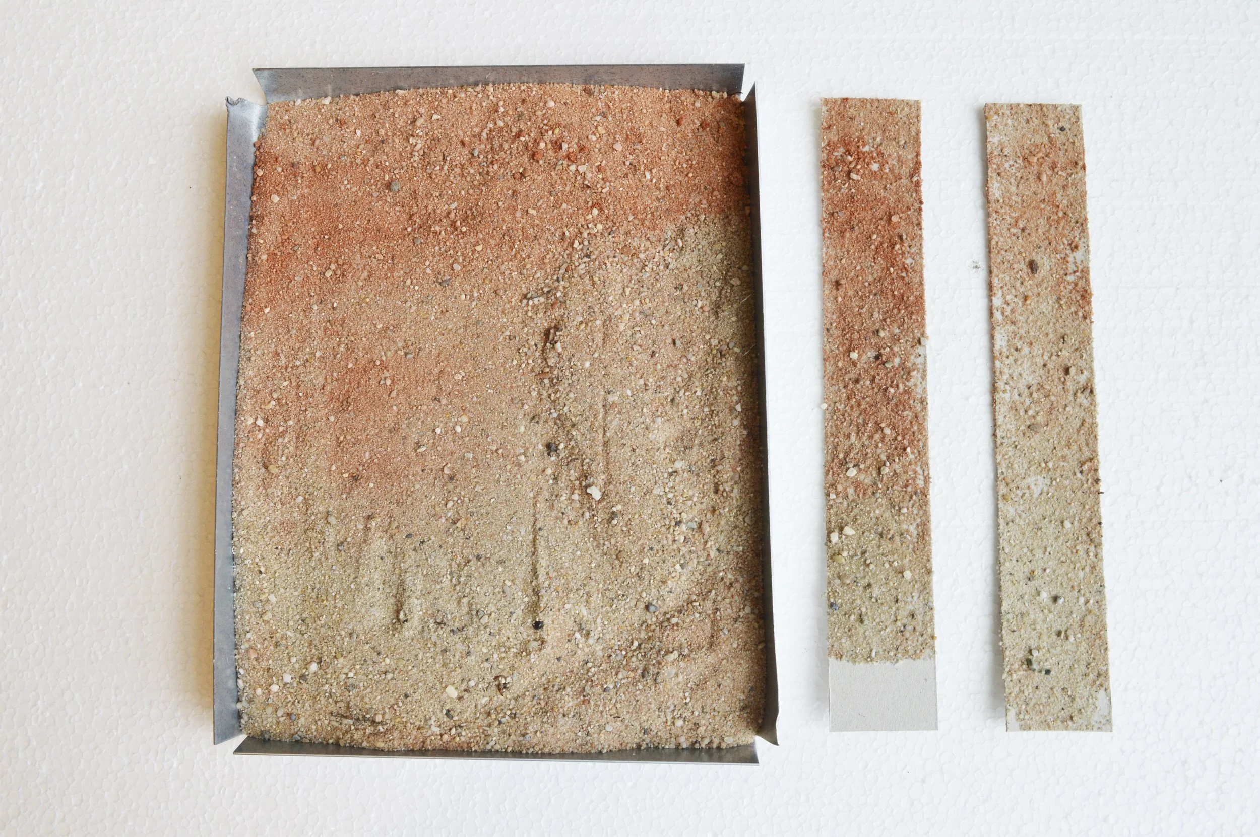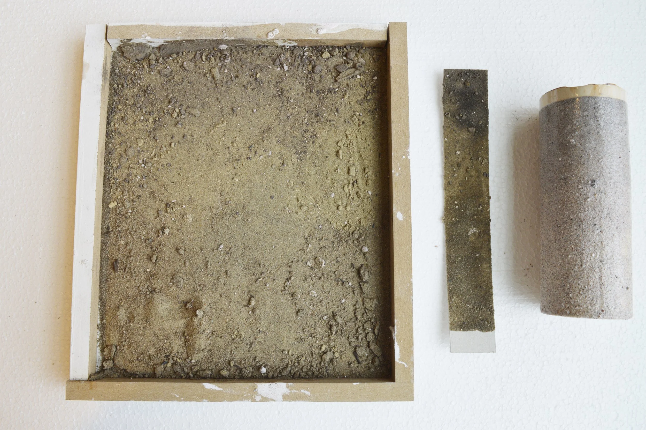 The sand integrated in the glazing on the outside of the ceramic objects has been used to filter water ‘contaminated’ with pigments, leaving behind a gradient of colour from top to bottom.