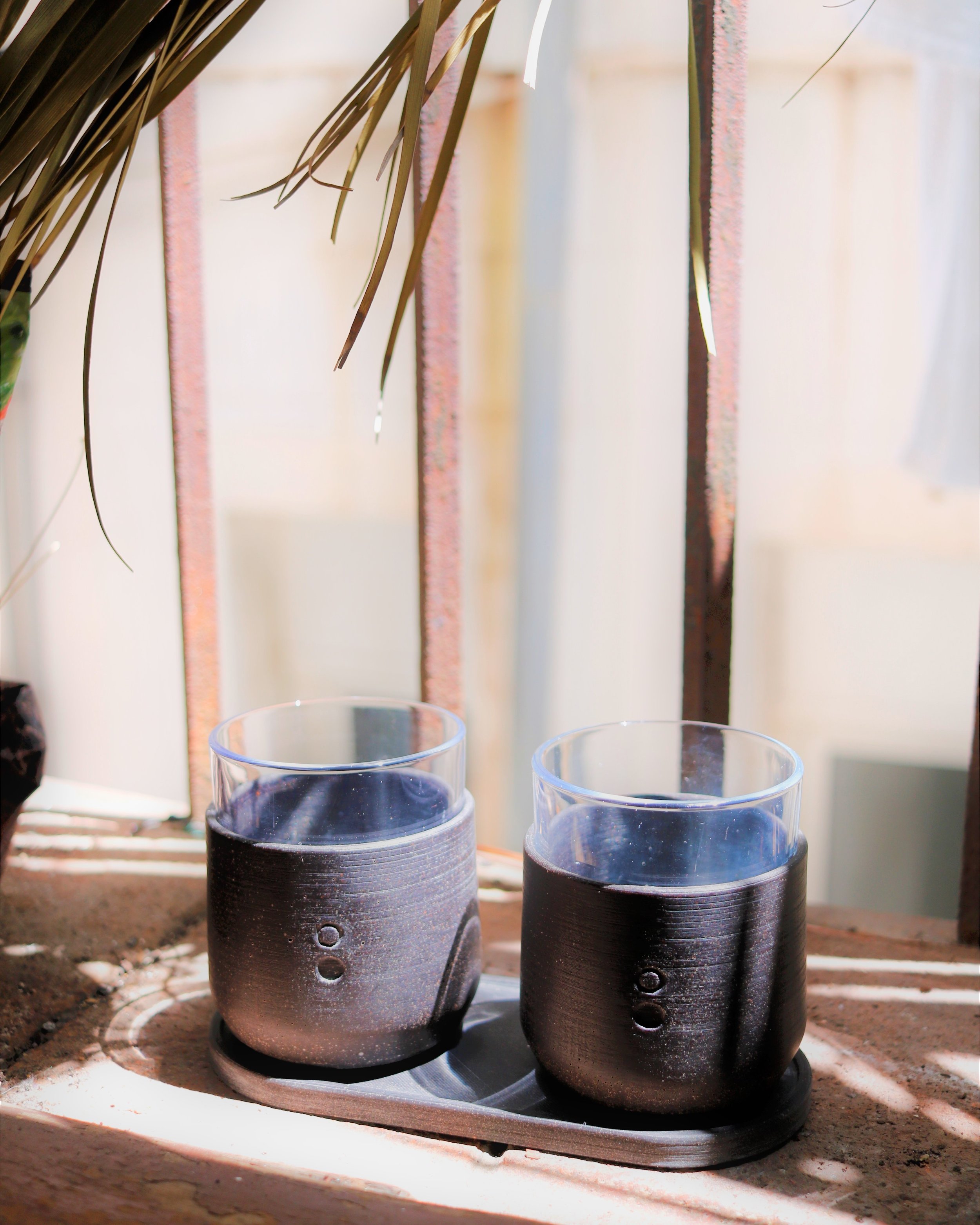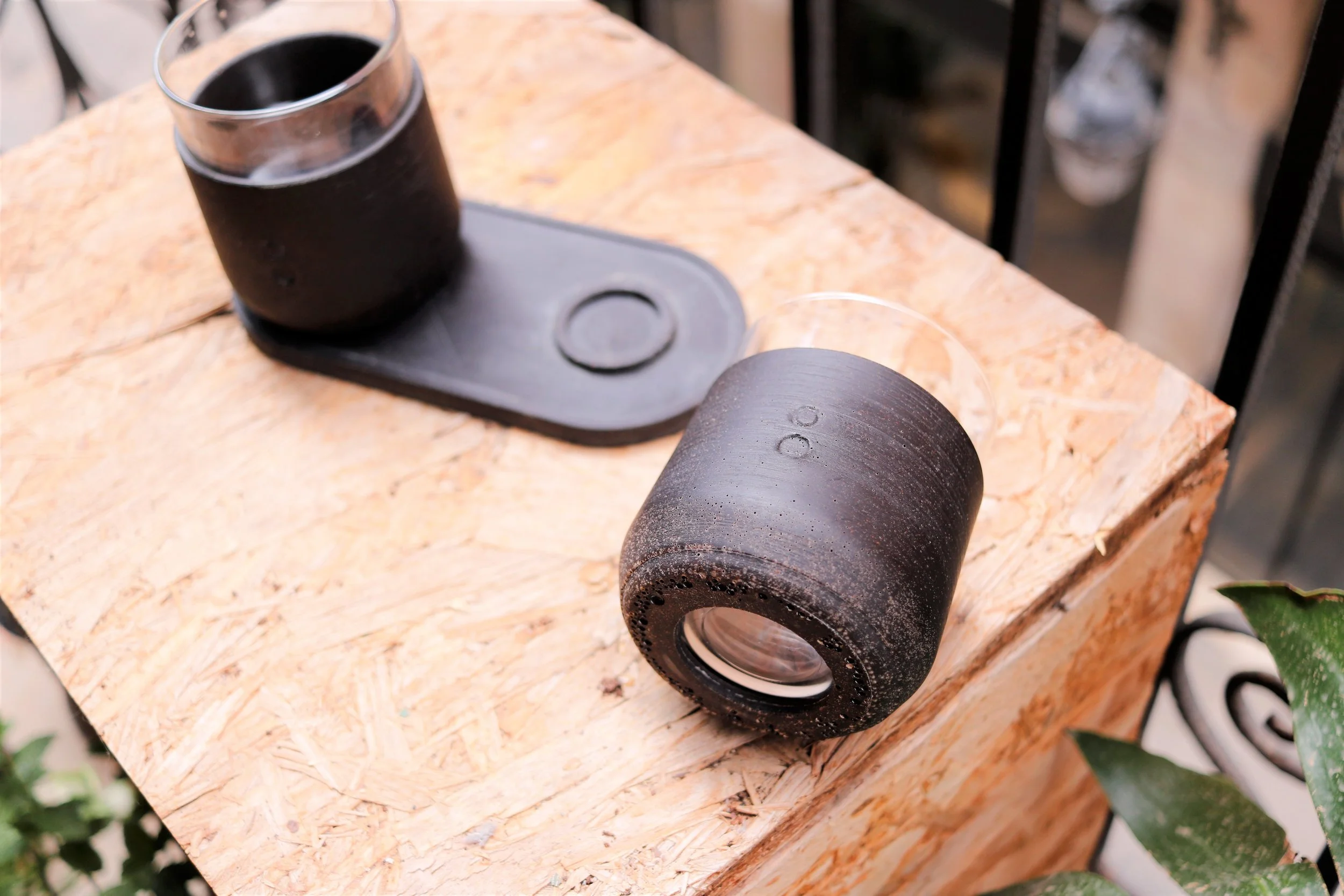 The first range of products made with the material are a set of coffee cups and a tray. The glass components are re-used Nutella jars while the coffee composite pieces keep your fingers from burning and make the cups pleasant to hold. It also keeps the hot beverages served in the cups warm.